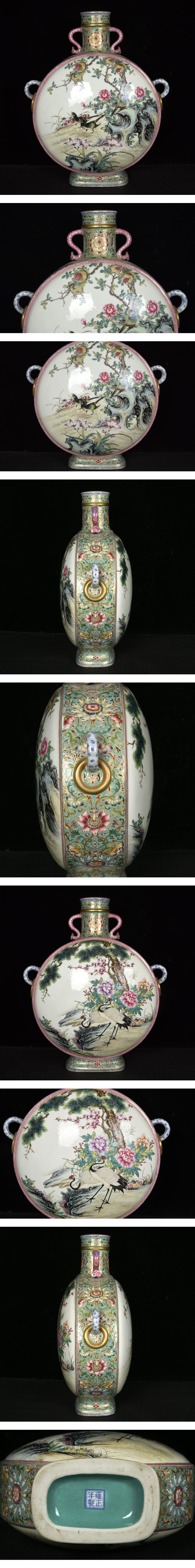 - NA209■大清雍正年製款 琺瑯彩描金開窗松鶴延年紋花鳥紋 双系扁壺 時代物 古玩 唐物 古陶磁器■