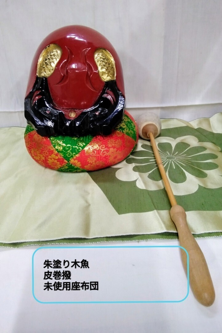 - g_t I287 仏具[朱塗り木魚皮巻撥未使用座布団] 3点セットです。朱塗り木魚は、浄土真宗/真宗大谷派/日蓮宗以外の宗派用です。