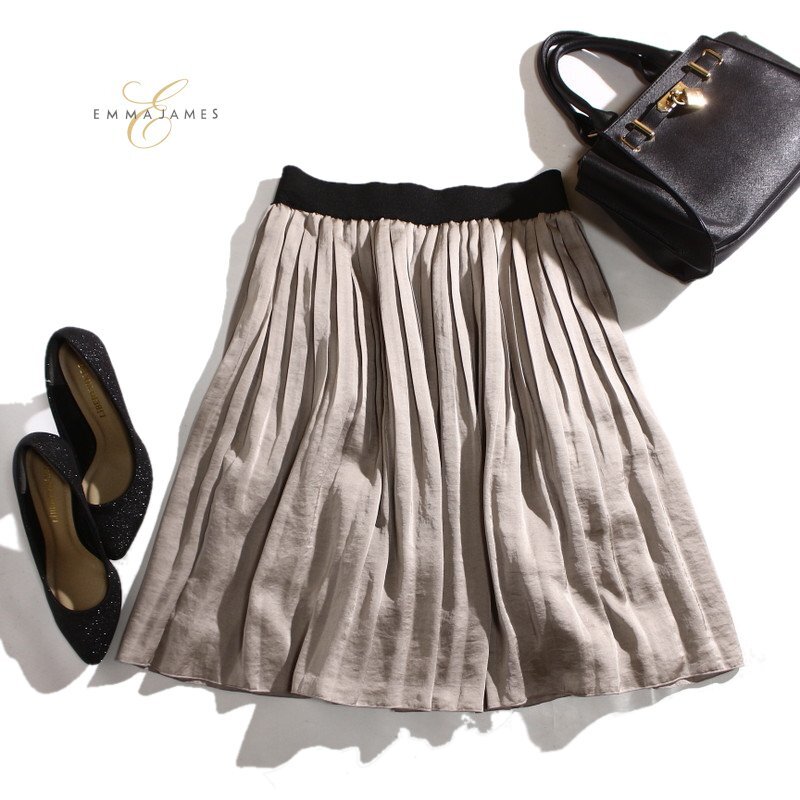 - 美品 EMMAJAMES エマジェイムス 艶 サテン プリーツスカート グレー グレージュ L ウエストゴム 膝下丈 フォーマル フレア オフィス 綺麗め