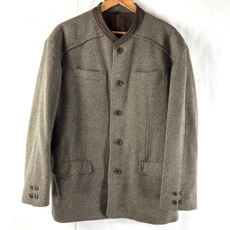 > スクープマン SCOOP MAN ジャケット スタンドカラー ツイード生地 ウール100% レザー襟 裏地付き ブラウン系 Mサイズ 922843