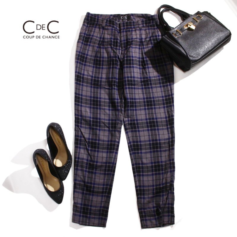 > 美品 クードシャンス COUP DE CHANCE 株) ワールド 秋 冬 毛18% チェック柄 テーパードパンツ 36 Sサイズ グレー 紺 黒 オフィス 通勤