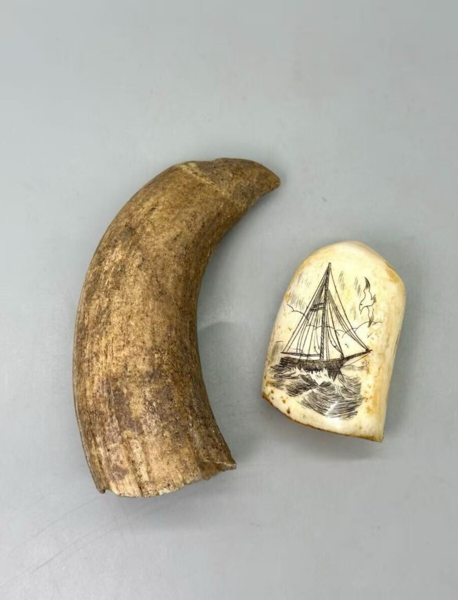 - 2点セット抹香鯨 マッコウクジラ 鯨歯 歯牙 鯨牙 印材 根付 骨董品 古美術品 重量約305.7g 置物 印鑑