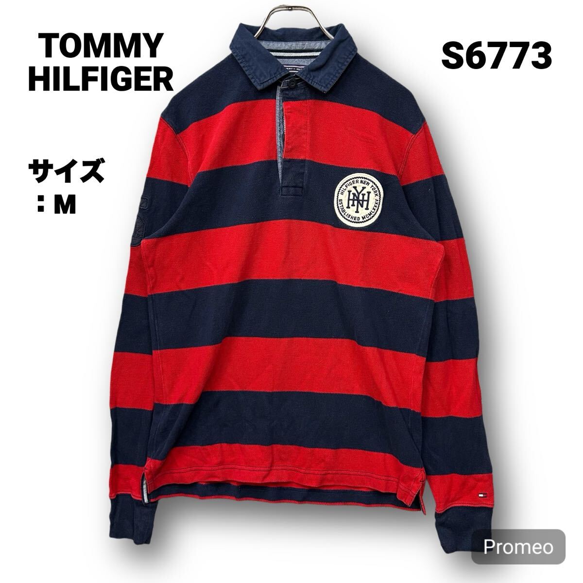 > 【S6773】 TOMMY HILFIGER トミーヒルフィガー ラガーシャツ 長袖ポロシャツ サイズM ボーダー 胸ロゴ 刺繍ロゴ メンズ トップス 最落なし