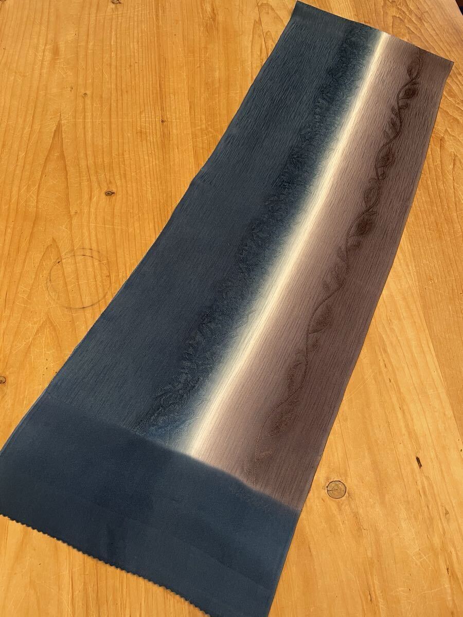 - 小間物きむら 81 未使用 帯揚げ 丹後ちりめん ロゴ入り バイカラー 花間道の織柄 褐返と葡萄鼠 長尺 カジュアル向け