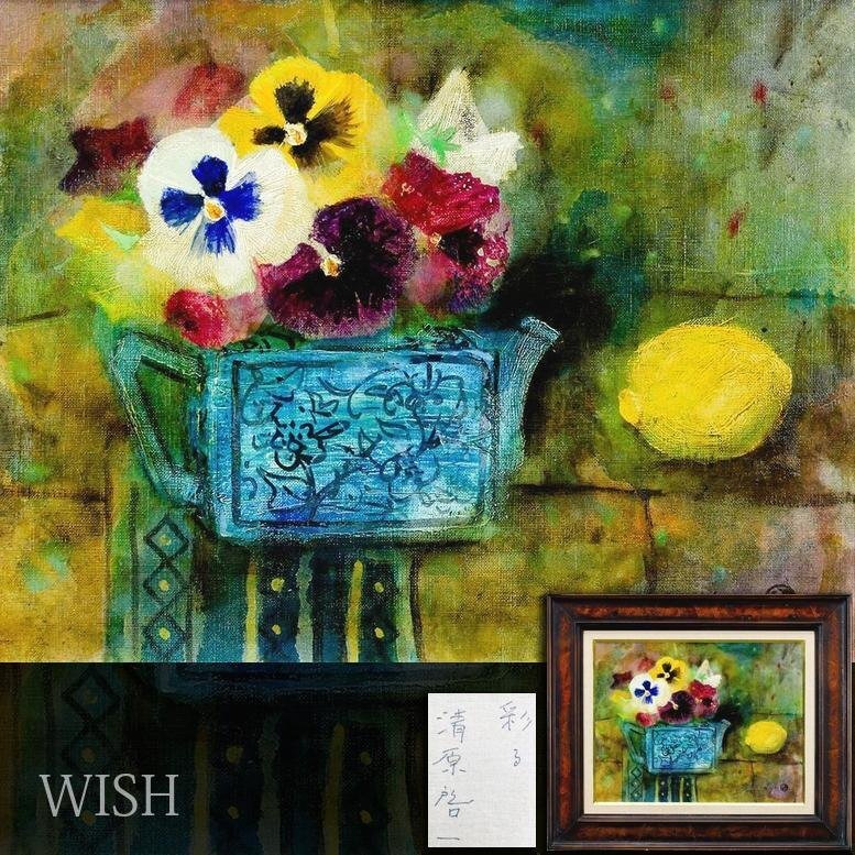 > 【真作】【WISH】清原啓一「彩る」油彩 6号 1978年作 ◆青の花器に咲く花々とレモン 〇日本芸術院会員 日展顧問 鶏の画家 #25102659