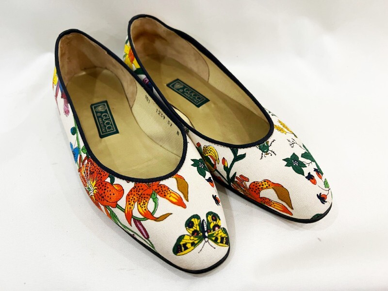 > ヴィンテージ GUCCI/グッチ フローラ ボタニカルパンプス ローヒール 花柄 アイボリー キャンバス レディース 37(24cm相当) 靴 総柄 USED