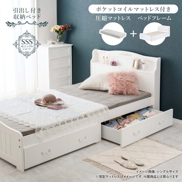 - ベッド セミシングルショート マットレス付き セット 引き出し 収納 姫系 宮棚 すのこ 通気性 ポケットコイル かわいい ID005 新品