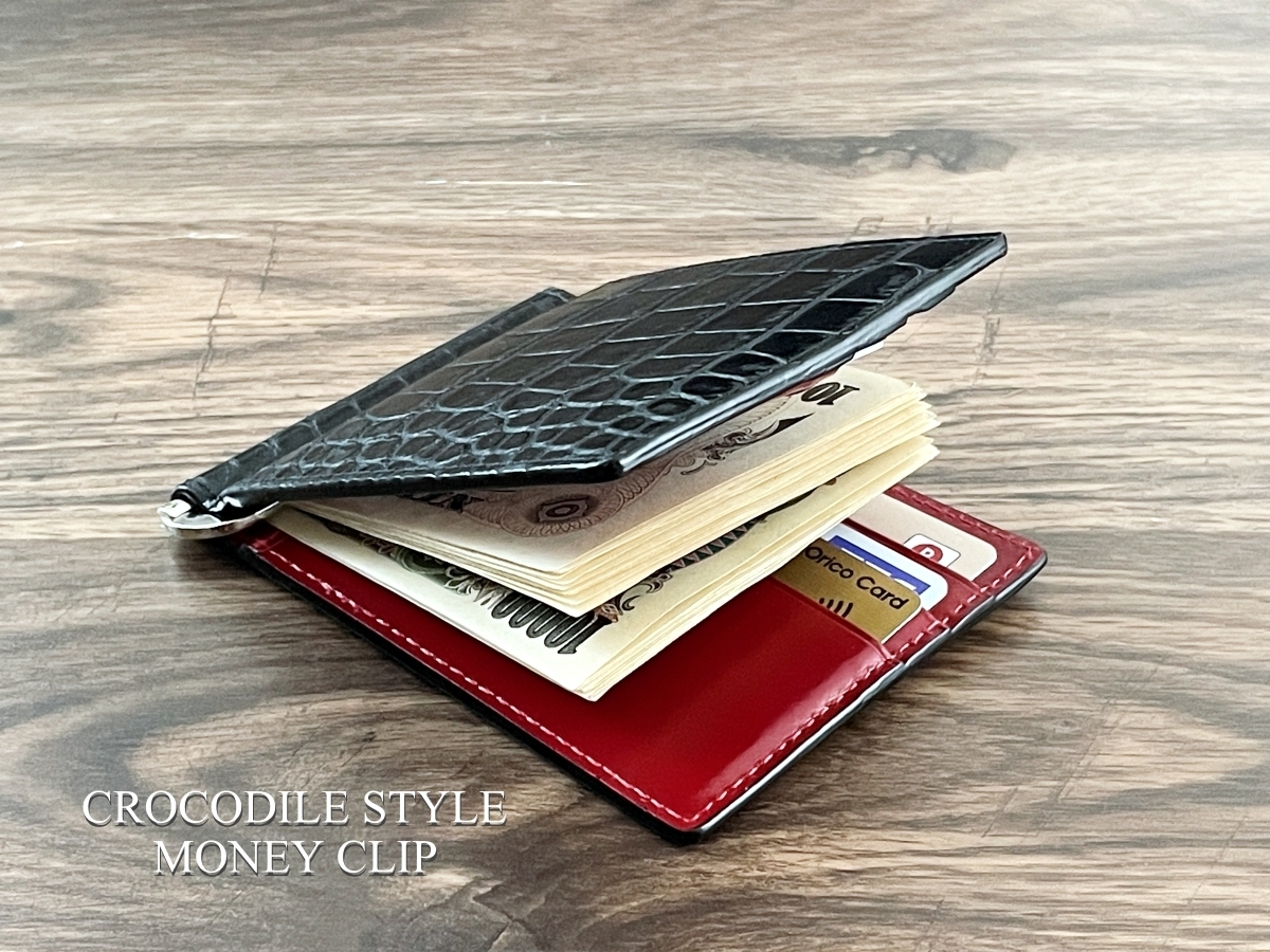 - 【新品 送料無料】クロコダイル 型押し マネークリップ ブラック 財布 札ばさみ 薄型 スリム 革 札入れ カードケース 二つ折り 牛革 本革