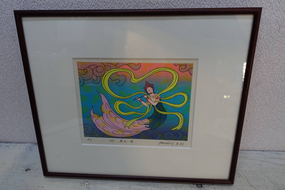 - (463)牧野宗則 『 飛天・笛 』 木版画 1989年 A.P版 直筆サイン入り 額付き 真作