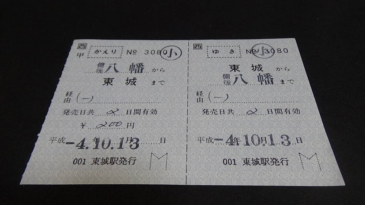 - □西 軟券 補充往復券【芸備線】東城から備後八幡まで 小 4-10.13 東城駅発行