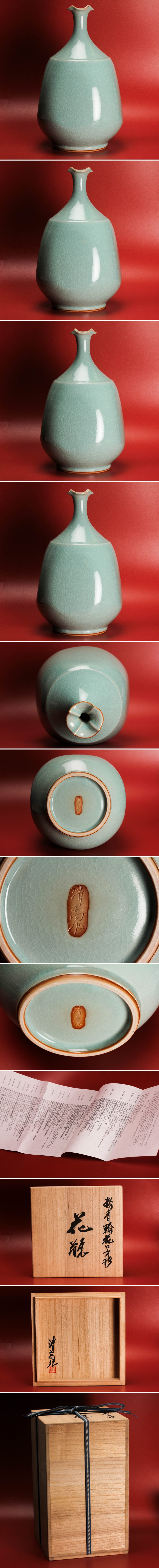 - 青木清高 高さ31.3cm 粉青輪花口方形花瓶 共箱 栞 本物保証