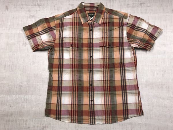 > エディーバウアー Eddie Bauer アメカジ アウトドア 両胸ポケット シアサッカー チェック 半袖ワークシャツ メンズ S 赤/オレンジ系