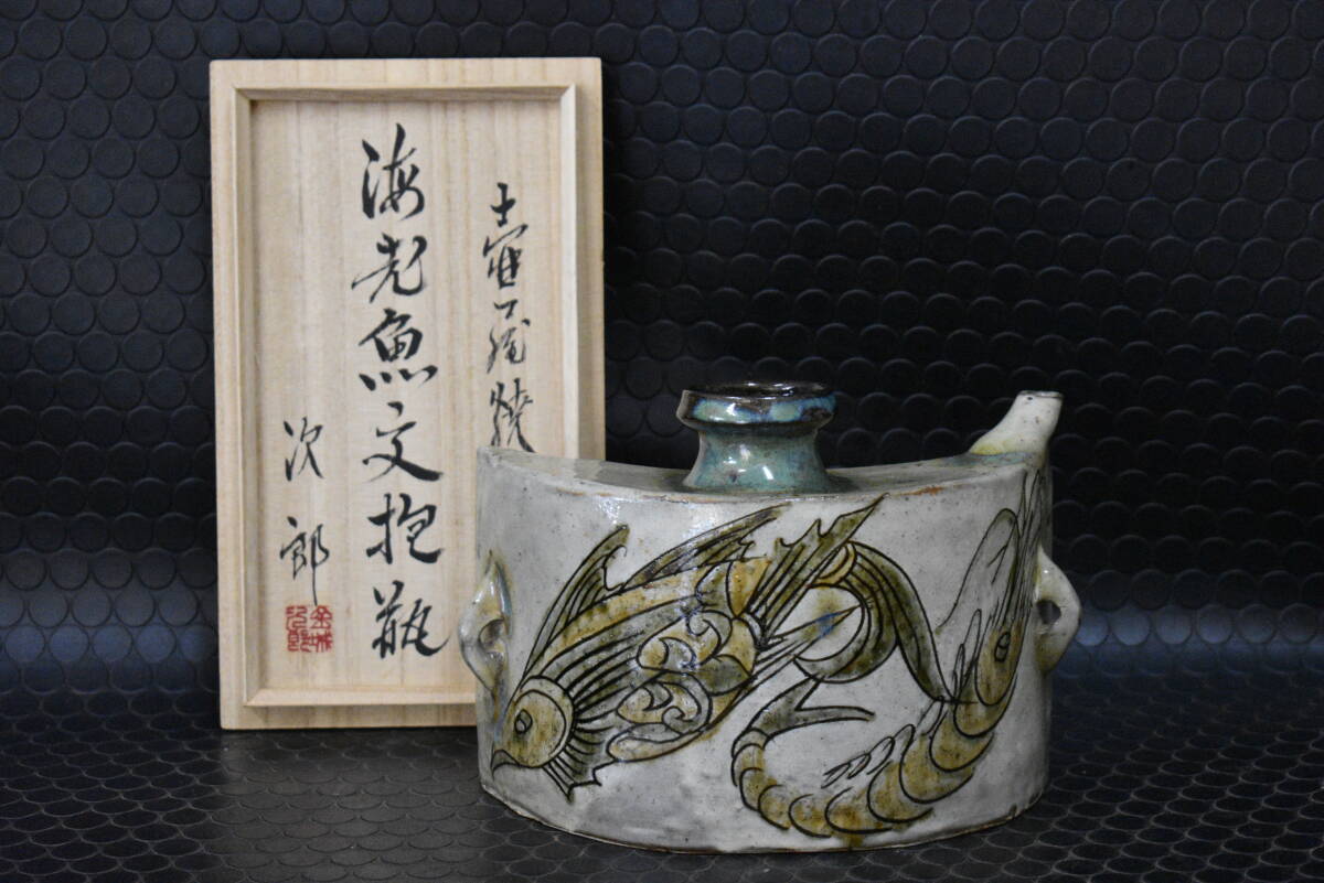 - うぶ品 時代物 人間国宝 金城次郎 作 琉球壺屋焼 海老魚文抱瓶 共箱 美品 古美術品