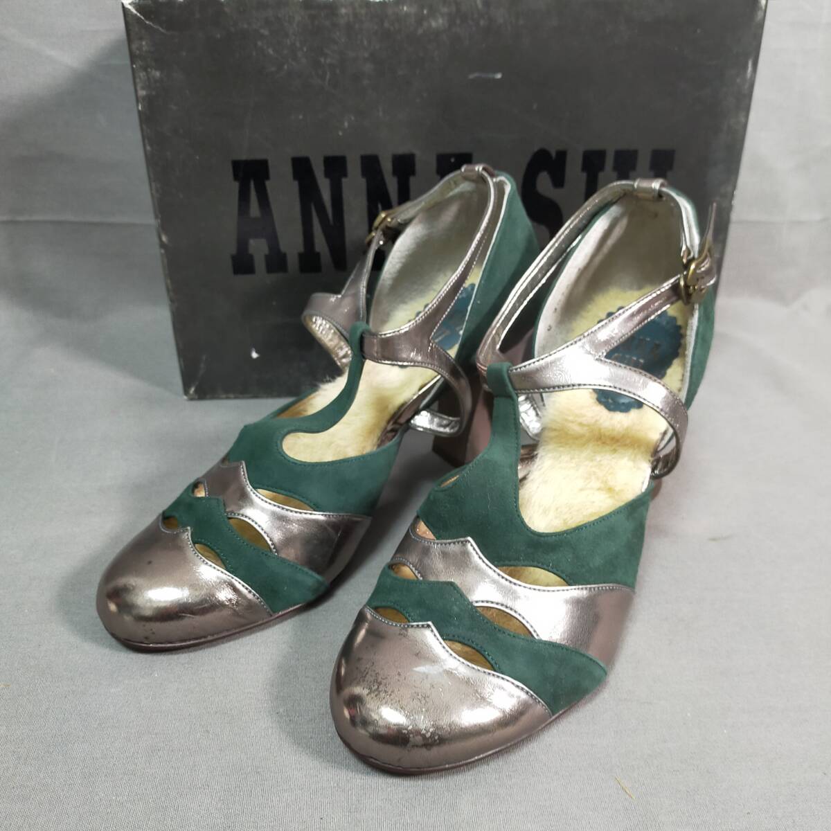 > 5710/28 GJ72321 ANNA SUI アナスイ ファー付きストラップパンプス シルバー×グリーン サイズ3 箱付き used 現状品