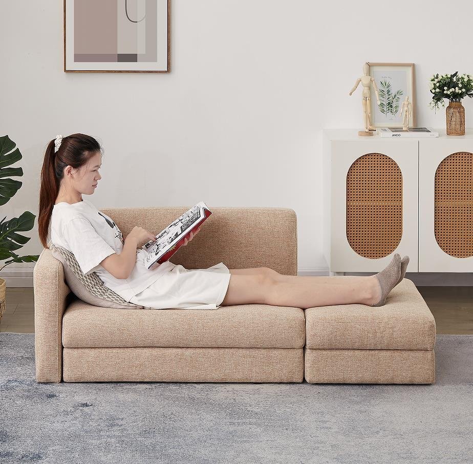 - ソファー 2人掛け 収納付き カウチソファー オットマン付き ファブリック 肘掛け 木脚外し可能 ローソファ コンパクト (ベージュ)
