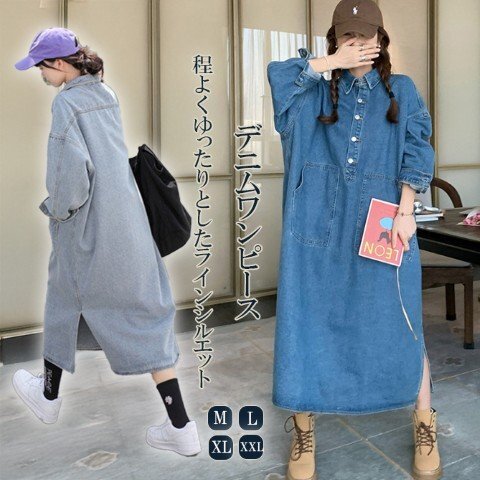- レディース シャツワンピース デニム きれいめ 着痩せ 羽織り大きめポケット XL レトロブルー