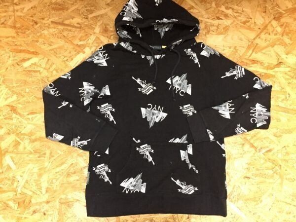 > FOR TOMORROW 綿100% NYC ニューヨーク お土産 スーベニア 総柄プリント 長袖スウェットシャツ パーカー カットソー メンズ 綿100% LL 黒
