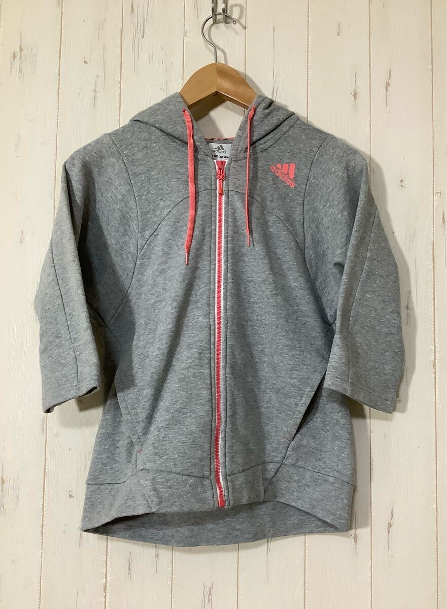 > た1789 adidas アディダス 七分袖 ジップアップスウェットパーカー M レディース グレー ロゴプリント 裏パイル CLIMALITECOTTON