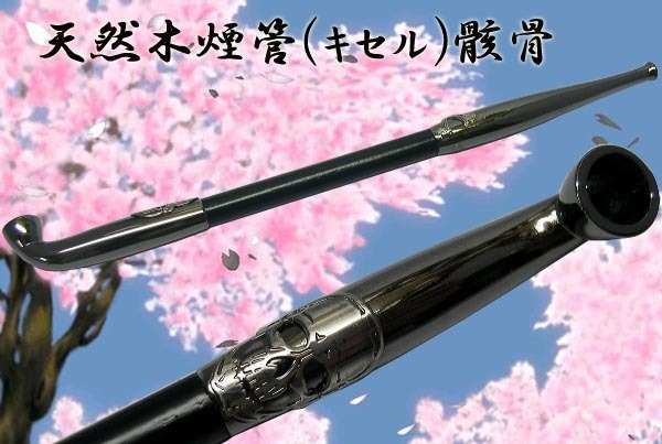 《< 新品 日本製 中尺 天然木 黒染めキセル(煙管) (約)20cm ガンメタ装飾(スカル)   >》