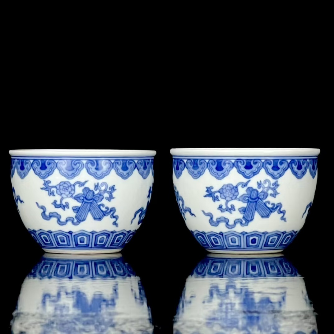 - 清時代 雍正年製款 古陶磁器 青花 花卉紋 杯一対 茶具 茶杯 茶道具 文案置物 時代物 骨董品 旧家蔵出し 唐物 中国古美術