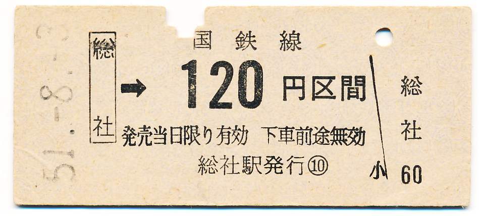 - 国鉄 金額式常備片道乗車券 総社→120円区間