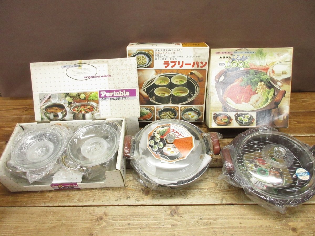 > 【N-8055】未使用 鍋 まとめ 3点 セット ステンレス 18-8 両手鍋 ホーロー 蒸し 調理器具 東京引取可【千円市場】