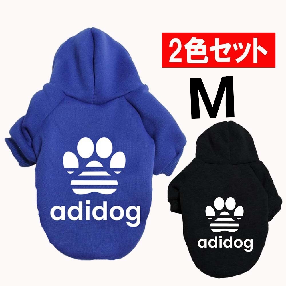 - M ブラック、ブルー 犬服 2色セットアディドッグ肉球パーカー 裏起毛パーカー裏起毛あったか