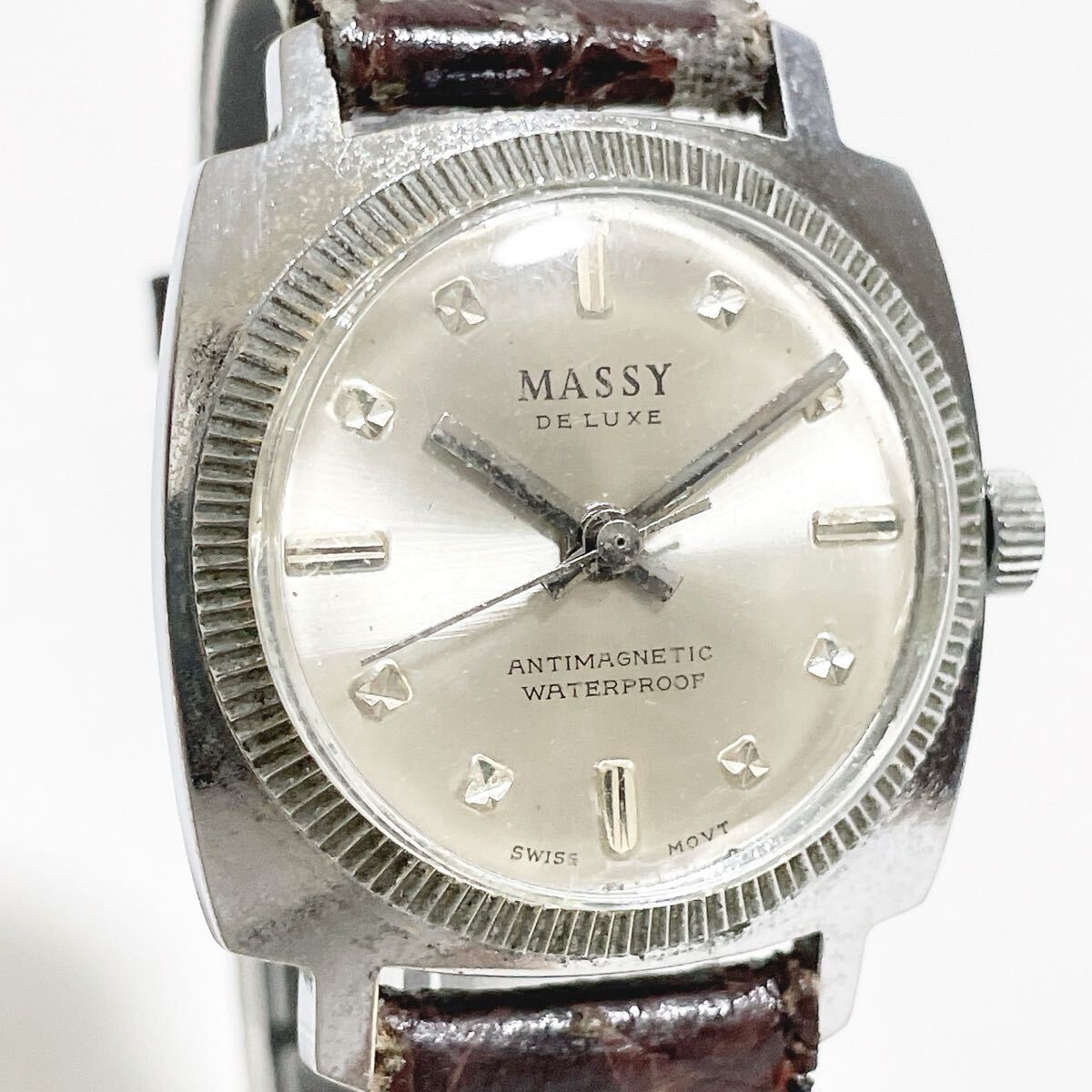 稼働品 MASSY マッシー DELUXE デラックス ヴィンテージ メンズ 手巻時計 スクエア シルバー サンレイ文字盤 スイス時計