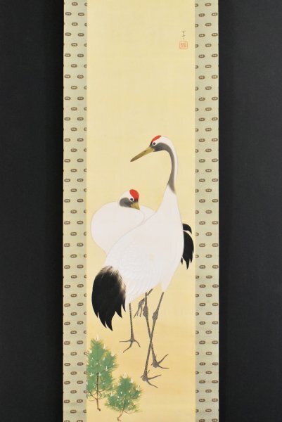- K6360 真作 広田百豊「双鶴図」絹本 合箱 肉筆 竹内栖鳳師事 つる 稚松 日本画 中国 書画 茶掛 掛け軸 掛軸 石川の人