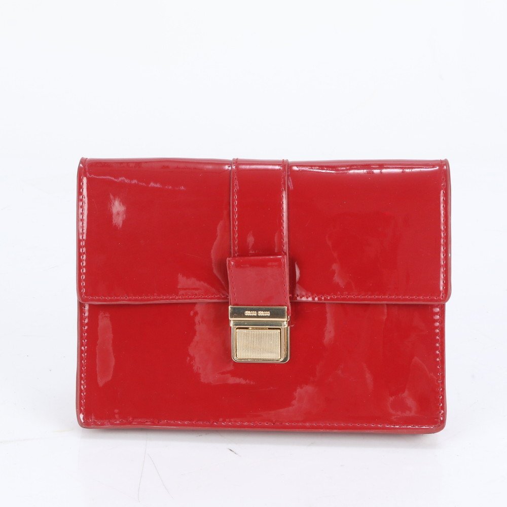 > 1円■美品■ミュウミュウ■パテント レザー クラッチ バッグ ハンド セカンド ポーチ トート ゴールド 金具 レディース RUE CK26-1