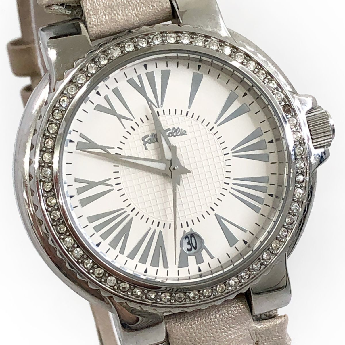 - 美品 Folli Follie フォリフォリ 腕時計 WF6A003SD クオーツ アナログ ラウンド ラインストーン ホワイト ベージュ カレンダー 動作確認済