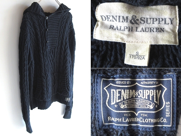 - DENIM&SUPPLY RALPH LAUREN デニム&サプライ ラルフローレン ロゴワッペン ハーフ釦 コットンリネン ケーブルニット パーカー S ネイビー