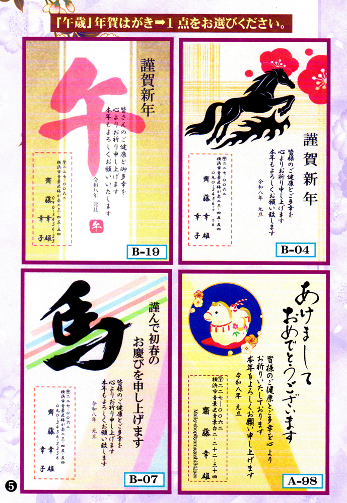 - 「午歳」お年玉付き年賀はがき印刷/4点から一つを選択・15枚コーナー<⑤>/差出人刷り込み・送料無料/文面の変更も出来ます。