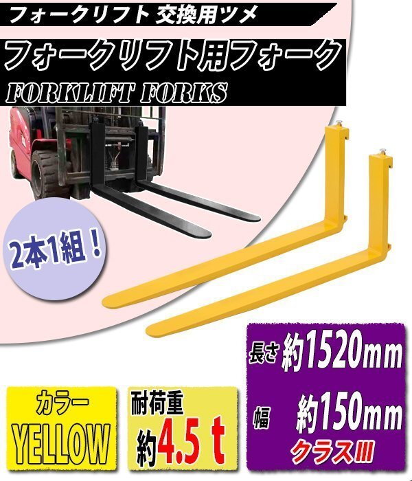 - 送料無料 フォーク 爪 2本セット 黄 長さ約1520mm 幅約150mm 耐荷重約4.5t 厚さ約50mm フォークリフト用 交換用 フォーク ツメ イエロー