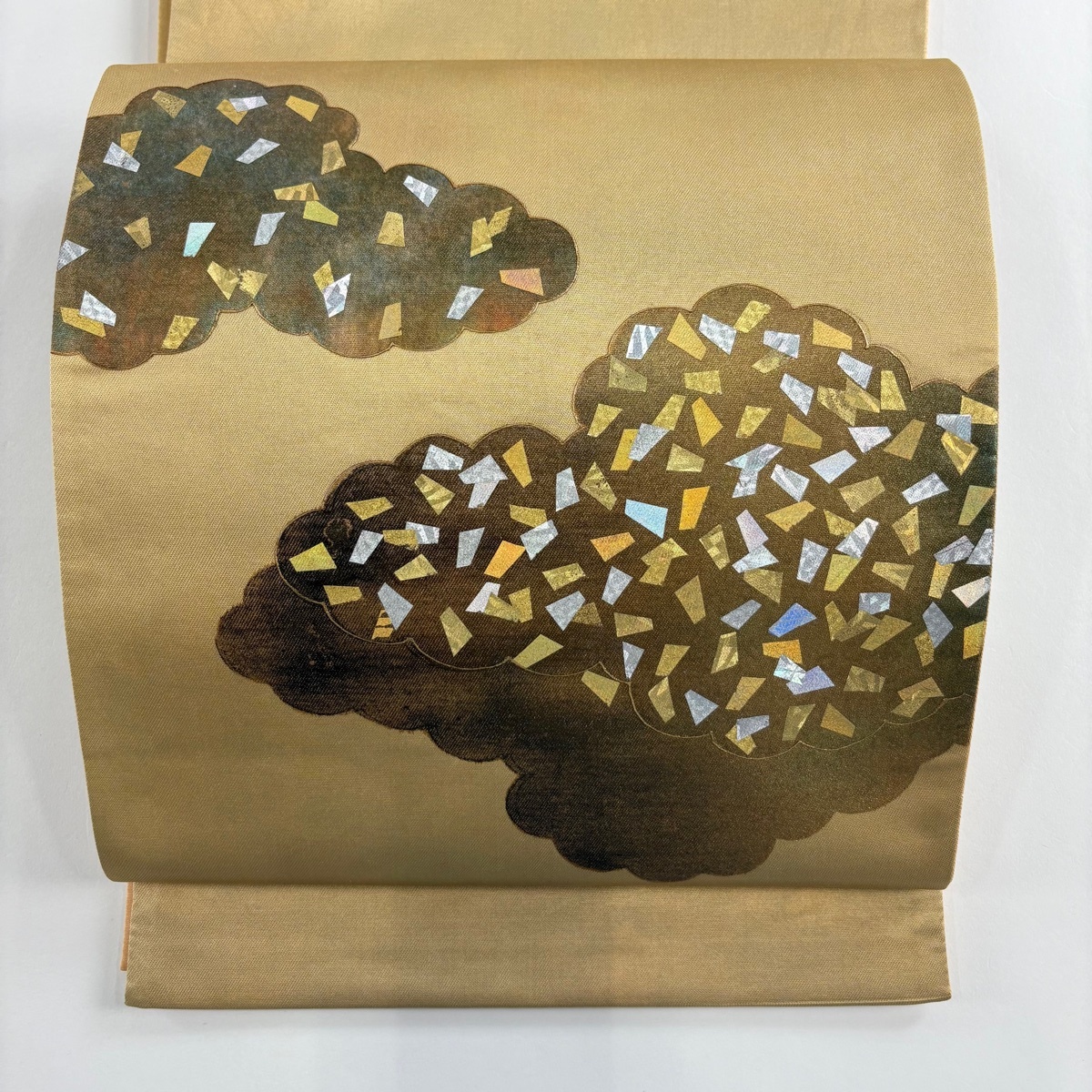 - 袋帯 秀品 箔散らし 雲文 金銀彩 箔 山吹色 お太鼓柄 正絹 【中古】
