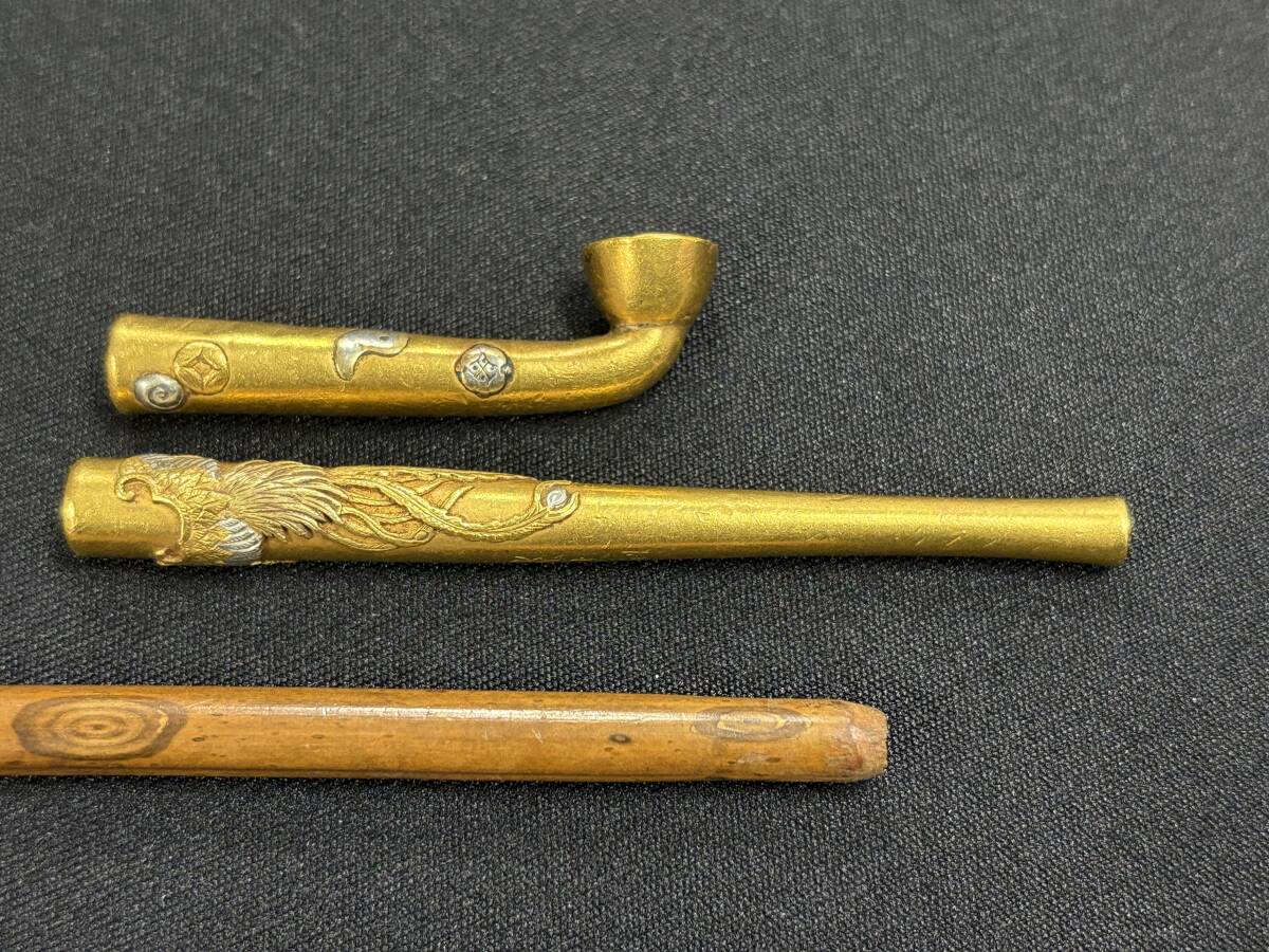 - ◆【純金(重さ30g) 純金刻印鳳凰羽煙管 刻銘:●光刻】キセル,喫煙具,骨董品,時代物