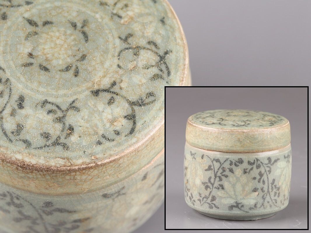 - 古美術 朝鮮古陶磁器 高麗青磁 白黒象嵌 蓋物 時代物 極上品 初だし品 D5014