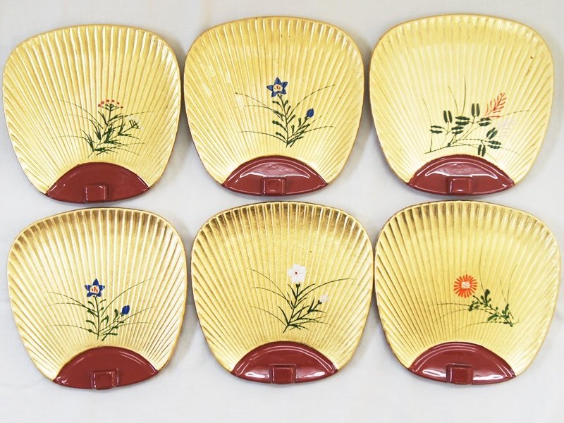 - 中古 ほぼ未使用【うちわ銘々皿 6枚セット】金箔 小皿 菓子皿 取り皿 団扇 柄違い 花柄 彩のうつわ