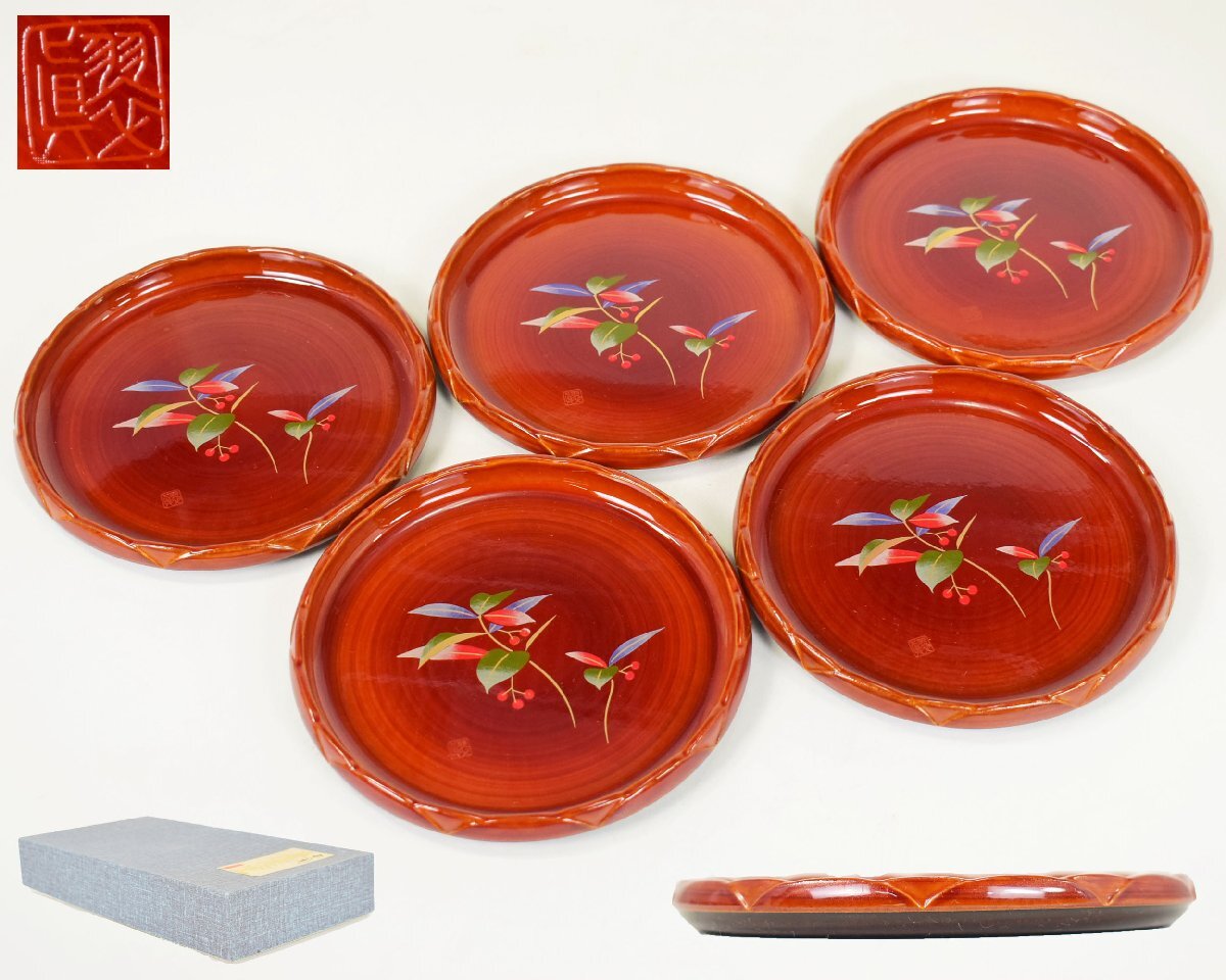 U789 【泉美】春慶塗 銘々皿 5客 小皿 丸皿 菓子皿 菓子器 懐石道具 紙箱入