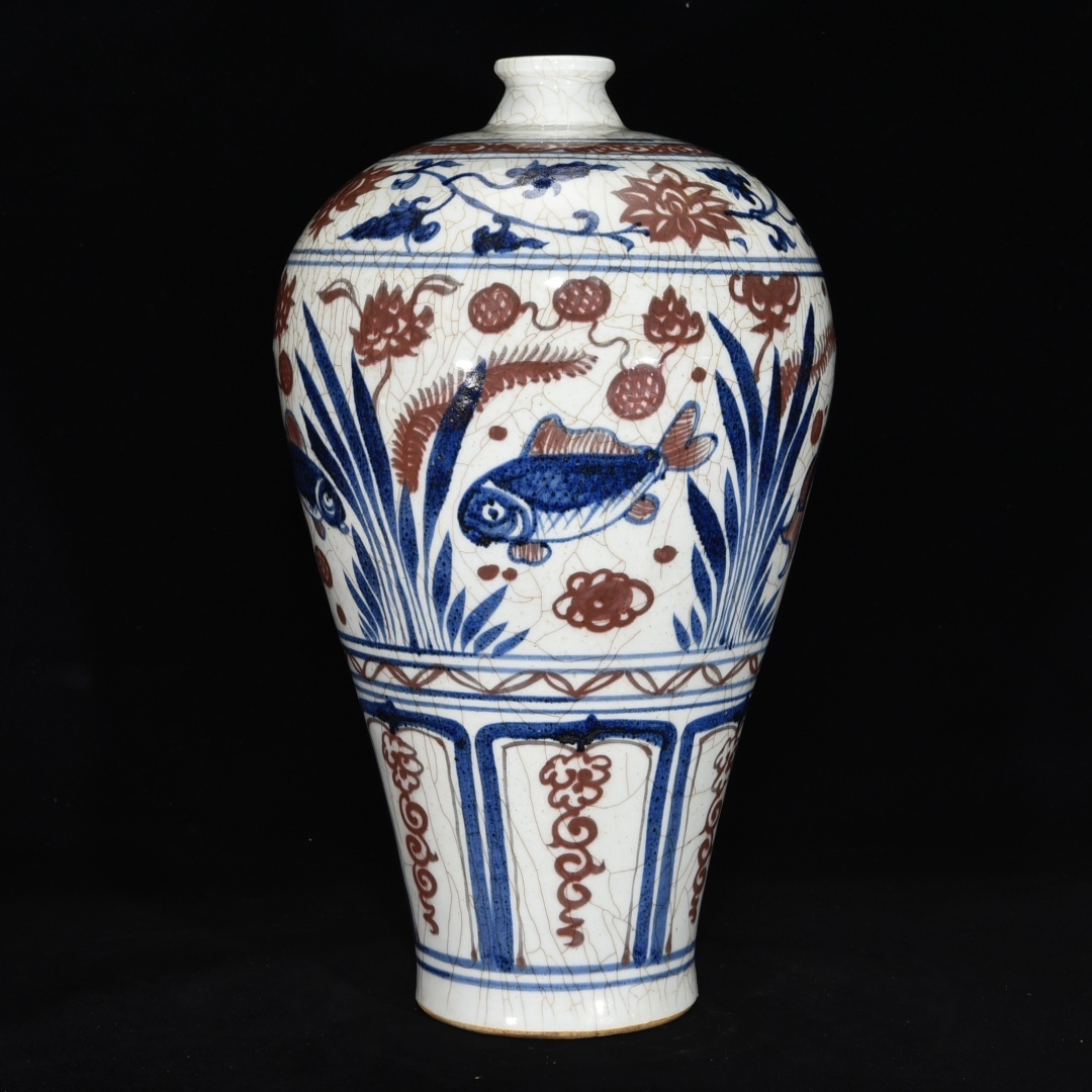 - 旧 元 青白 釉に赤魚藻紋 梅瓶 唐磁 古陶磁器 陶芸 中国古美術 古賞物 古置物 唐物 S711