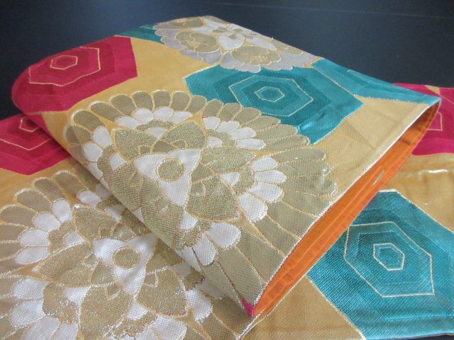 - 1円 良品 袋帯 正絹 和装 和服 亀甲 草花 宝相華 お洒落 六通柄 長さ400cm【夢職】★