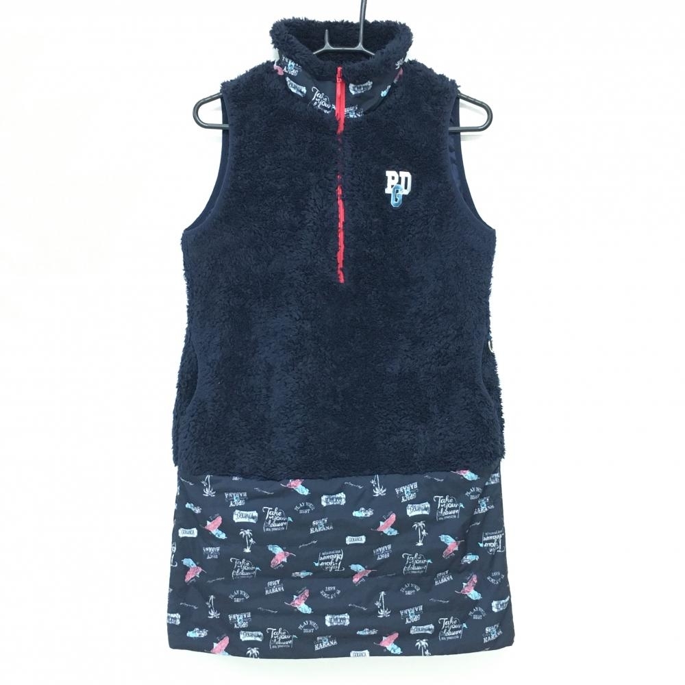 - 【美品】パラディーゾ ノースリーブ中綿ワンピース ネイビー ボア切替 ネック・スカート総柄 レディース L ゴルフウェア Paradiso