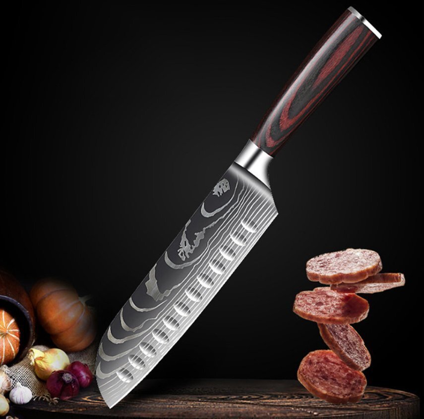 > 全長31cm ナイフ ダマスカス 包丁 キッチン家庭用 菜切り包丁 カラフル木製ハンドル 7インチ三徳包丁 大型和風包丁 本鋼ヘッド 骨切り包丁