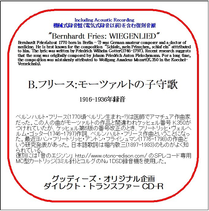 - B.フリース:モーツァルトの子守歌/1916-1936年録音/送料無料/ダイレクト・トランスファー CD-R