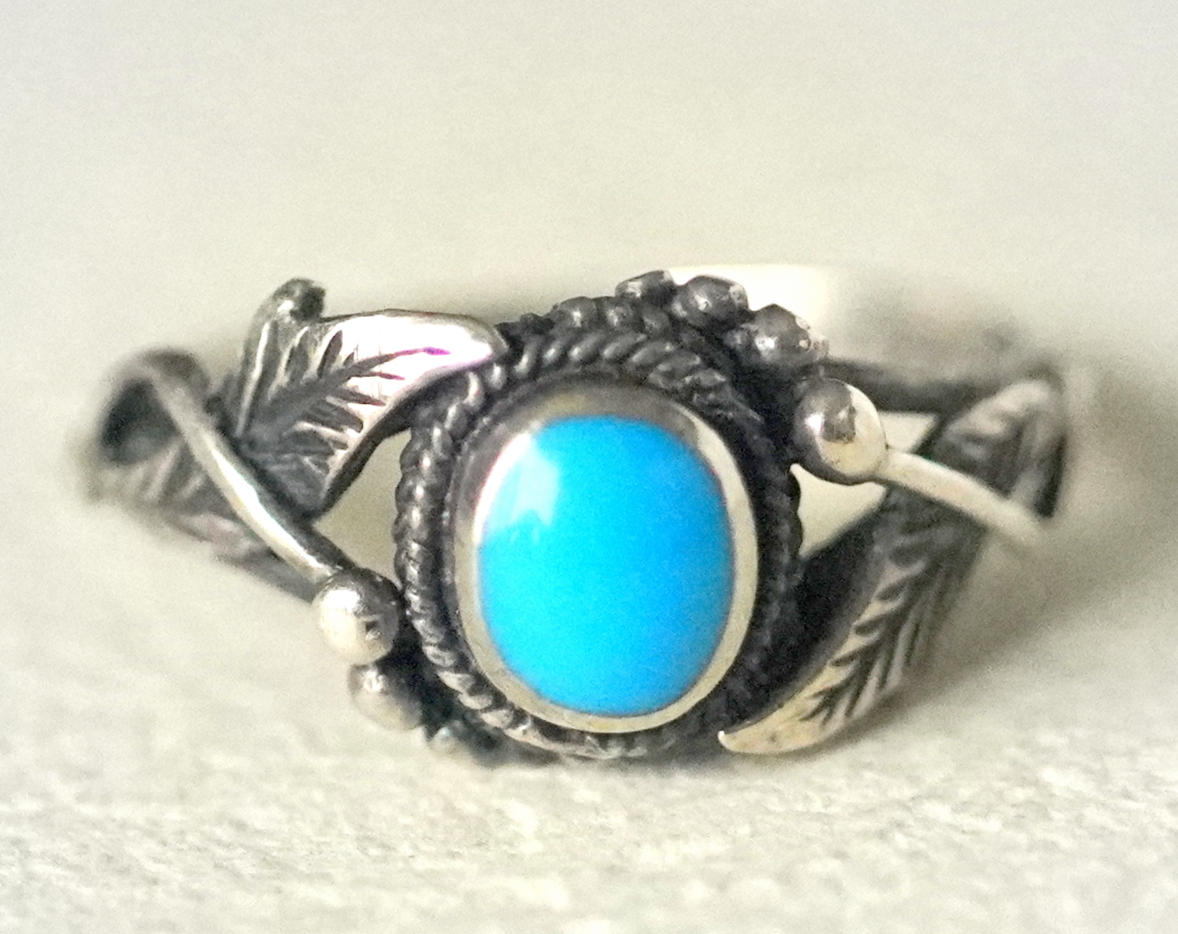 - シルバー925製 ターコイズカラー エスニック 葉っぱ模様リング 約7号サイズ