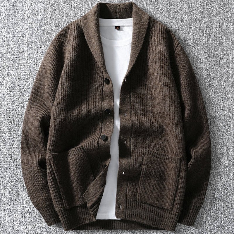 > 新品 ウール混 ニット カーディガン リブニット 秋冬 厚手 襟付き 無地 セーター メンズ 秋冬 暖かさ ニットジャケット ブラウン T6176-3XL