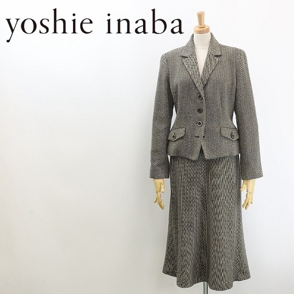 > 【HA870】◆yoshie inaba ヨシエイナバ ヘリンボーン柄 ウール ツイード ジャケット&スカート スーツ セットアップ ベージュ×ブラック 9