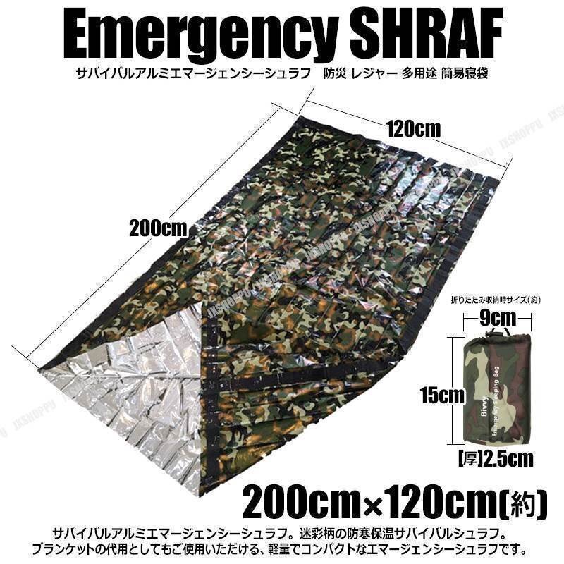 - 送料0円 アルミ エマージェンシー シュラフ 寝袋 [迷彩グリーン] 防災 サバイバル アルミシート 迷彩 カモフラ 防寒 緊急 非常 キャンプ