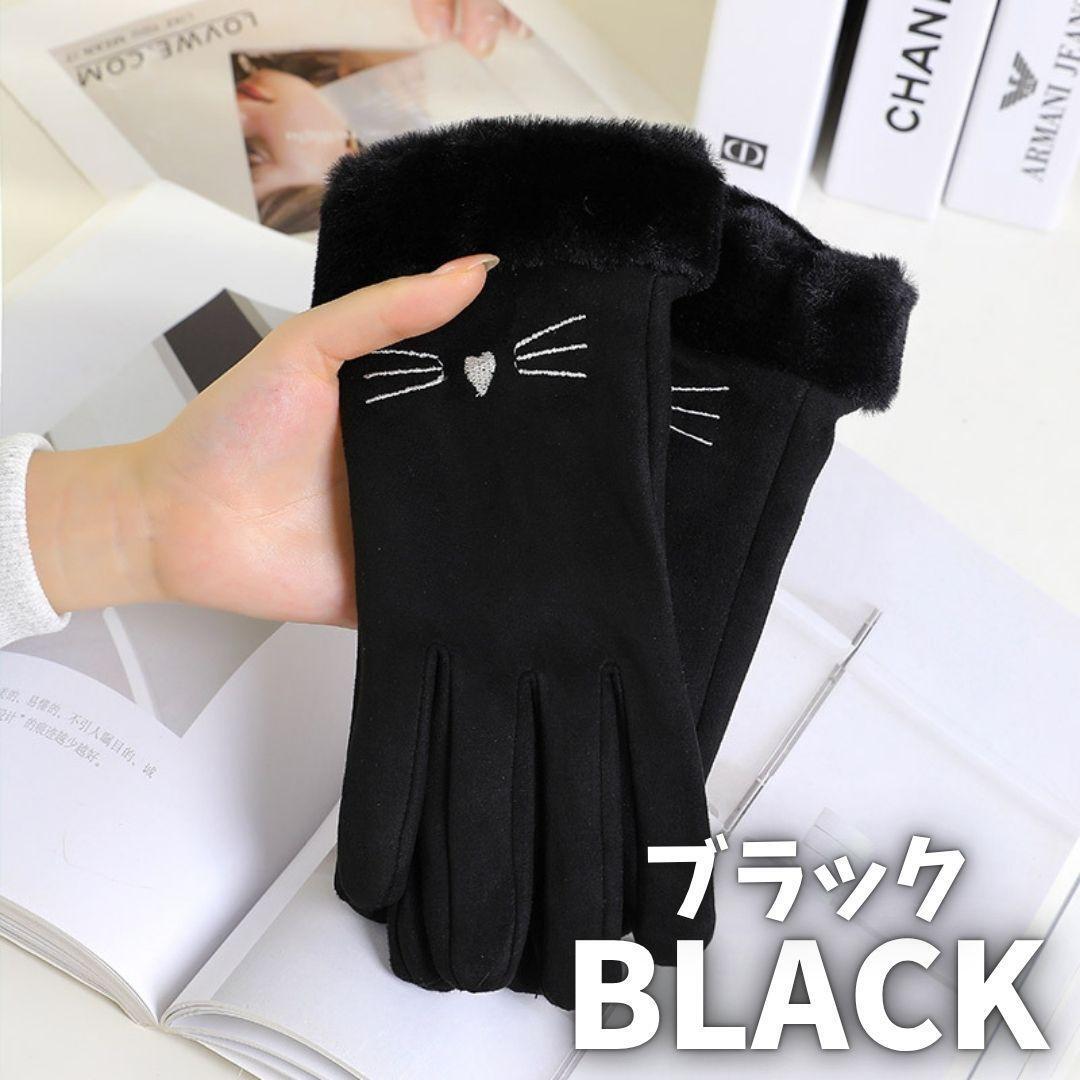 - 465 大人 可愛い キャット刺繍 グローブ フェイクファー ボア あったか 防寒 防風 寒さ対策 ネコ 猫 レディース ブラック 黒
