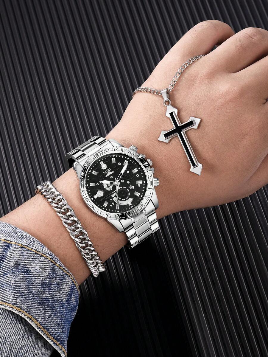 > 腕時計 メンズ セット 1セット メンズ腕時計 ビジネスカジュアル ファッション カレンダー ステンレススチールバンド クォーツ時